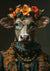 Auf diesem Gemälde sieht man eine Kuh mit einer runden Brille und einem Blumenkopfschmuck, verziert mit orangefarbenen und roten Blumen. Mit geschichteten Ketten und einem detaillierten Kleidungsstück wirkt die Kuh fast wie eine raffinierte anthropomorphe Kreatur.