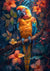 Auf diesem Gemälde sehen Sie einen lebhaften Papagei mit blauen und orangefarbenen Federn, der auf einem Ast sitzt, umgeben von leuchtend orangefarbenen und gelben Blumen sowie üppigem grünen Laub. Der Hintergrund ist dunkel, wodurch der Papagei und das Laubwerk besonders gut zur Geltung kommen.