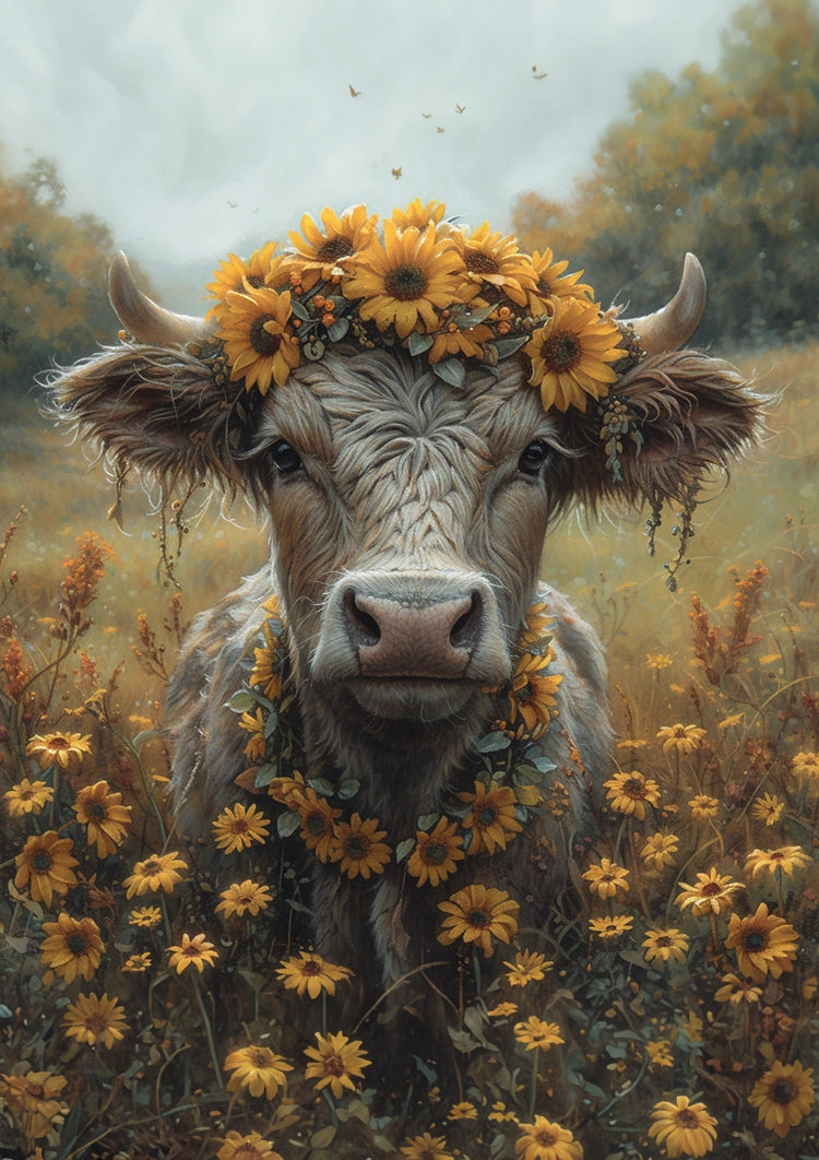 Dieses Gemälde zeigt eine Kuh, die in einem Feld zwischen Sonnenblumen steht und eine Sonnenblumenkrone trägt. Der Hintergrund besteht aus einer Wiese mit weiteren gelben Blumen und Bäumen, was eine ruhige, natürliche Atmosphäre schafft.