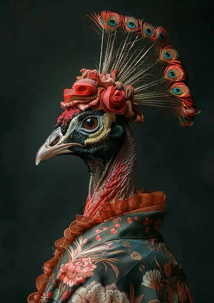 Auf diesem Gemälde ist ein Truthahn in prächtiger Kleidung mit Blumenmotiven und einem Kopfschmuck, der mit Blumen und Pfauenfedern verziert ist, dargestellt. Das feine Seitenprofil des Vogels wird vor einem dunklen Hintergrund gezeigt, mit lebendigen und detaillierten Akzenten.