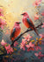In diesem Gemälde sehen Sie zwei niedliche rosa Vögel auf einem Ast, umgeben von lebendigen Blüten. Die warme Farbmischung und sanft fallende Blütenblätter schaffen einen ruhigen, malerischen Hintergrund.