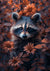 Dieses Gemälde zeigt einen Waschbären mitten in orangefarbenen Blumen und Blättern, mit auffälligen schwarz-weißen Gesichtszügen und einem direkten Blick in die Kamera.