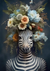 Dieses Gemälde zeigt ein nach vorne gerichtetes Zebra mit einem aufwendigen Kopfschmuck aus verschiedenen Blumen und Grün vor einem dunklen Hintergrund.