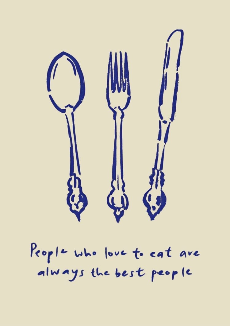 Dieses abstrakte Gemälde zeigt eine Illustration von Besteck. Löffel, Gabel und Messer sind in Blau auf einem hellbraunen Hintergrund gezeichnet, mit dem Text 'People who love to eat are always the best people' darunter geschrieben.