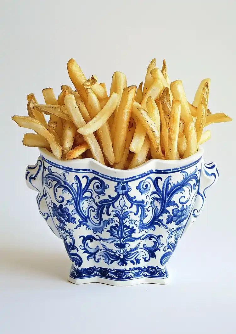 Dieses Gemälde zeigt einen Stapel Pommes Frites, serviert in einem eleganten blau-weißen Keramikbehälter mit Blumenmotiven und Griffen auf beiden Seiten vor einem neutralen Hintergrund.