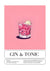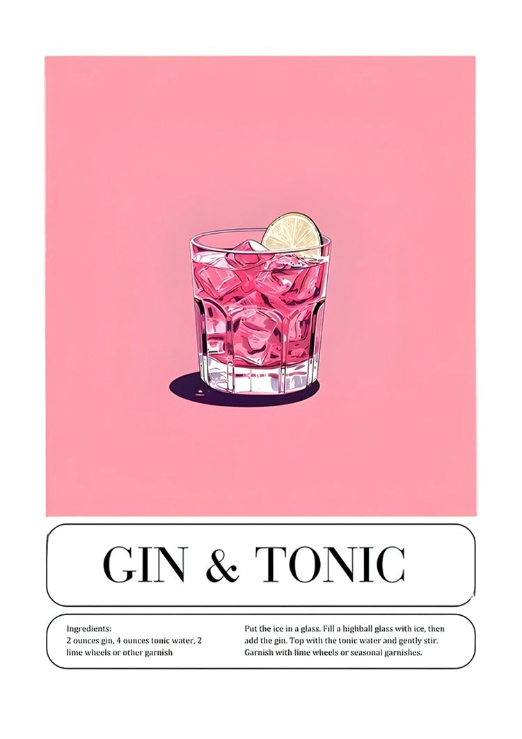 Dieses Gemälde zeigt eine schöne Illustration eines Gin Tonics mit Eis und einer Limettenscheibe vor einem rosa Hintergrund. Unter dem Bild befindet sich ein Rezept mit Zutaten und Zubereitungsschritten.