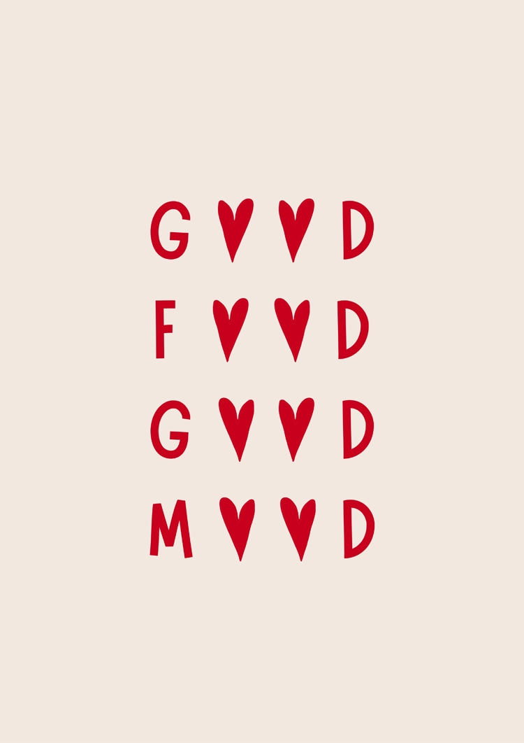 Ein Gemälde mit der Aufschrift 'Good Food Good Mood', abwechselnd mit roten Herzformen, auf einem sanft-beigen Hintergrund.