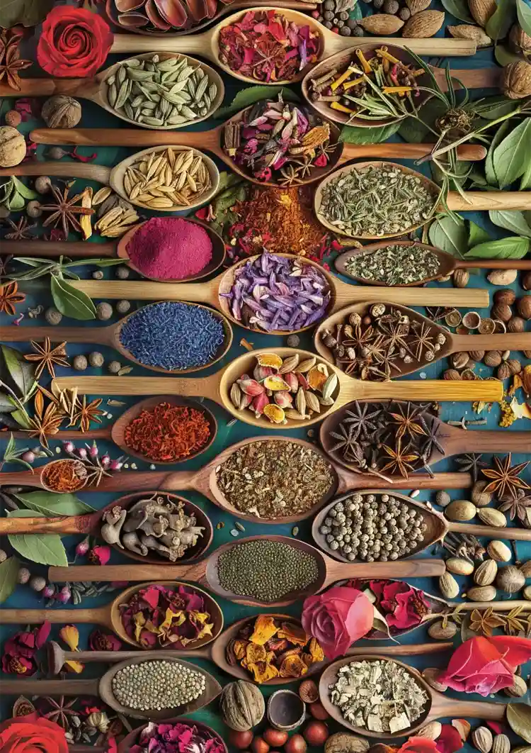 Dieses Gemälde zeigt eine farbenfrohe Darstellung von Gewürzen, Kräutern und getrockneten Blumen, die auf einem dunklen Hintergrund in Holzlöffeln arrangiert sind.