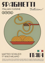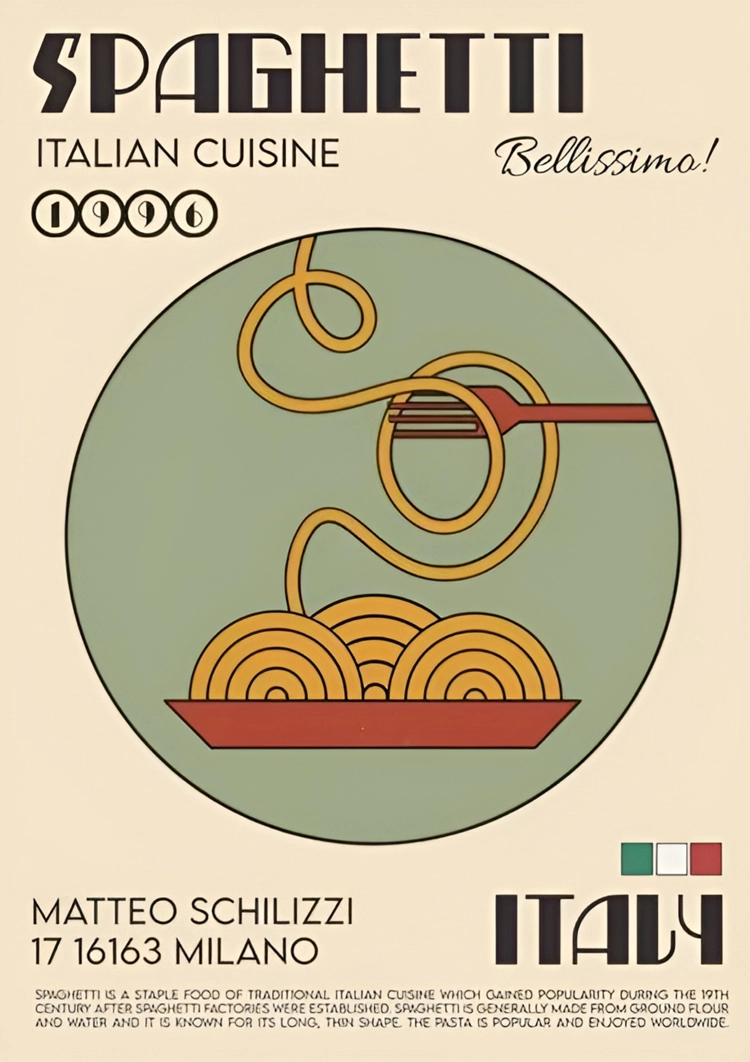 Ein Gemälde im Retro-Stil mit einer Illustration einer Gabel, die Spaghetti dreht, mit stilisiertem Text, der italienische Spaghetti als beliebtes Essen bewirbt.