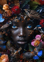 Dieses Gemälde fängt den Blick einer Person mit auffälligen blauen Augen ein, umgeben von lebendigen Blumen und detaillierten Vögeln, wodurch eine bezaubernde Verschmelzung von Mensch und Natur entsteht.