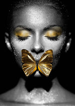 Ein Schwarz-Weiß-Porträt zeigt eine Person mit geschlossenen Augen, einer schimmernden Haut, die mit Glitzer bedeckt ist, und goldenem Augen-Make-up. Über ihrem Mund ist ein goldener Schmetterling platziert, was einen auffälligen Kontrast erzeugt.