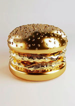 Dieses Gemälde zeigt einen digital dargestellten goldenen Burger mit Brötchen, Pastete und Zutaten, alle in einer glänzenden goldenen Textur dargestellt.