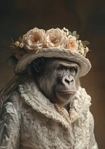 Dieses Gemälde zeigt ein digitales Bild eines Schimpansen, der ein elegantes Spitzenkleid trägt, komplett mit einem Blumenhut mit cremefarbenen Rosen. Der dunkle, zurückhaltende Hintergrund betont die Eleganz der Kleidung und den Ausdruck des Schimpansen.