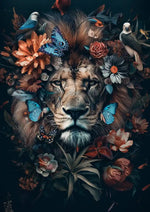 Dieses Gemälde fängt eine lebendige Szene eines Löwen ein, umgeben von bunten Blumen, Schmetterlingen und Vögeln. Die Kombination aus wilden Tieren und Flora schafft eine harmonische und lebendige Komposition vor einem tiefen, dunklen Hintergrund.