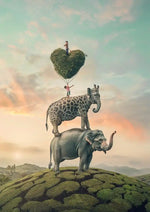 Dieses Gemälde zeigt eine surreale Szene, in der zwei Elefanten mit zwei Kindern zusammenkommen. Der malerische Himmel verstärkt auf künstlerische Weise die verträumte Qualität dieser fantasievollen Darstellung.