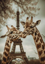 Dieses Gemälde zeigt, wie zwei Giraffen sich aneinander schnuppern, mit dem Eiffelturm im Hintergrund. Das Bild hält einen liebevollen Moment vor dem ikonischen Pariser Wahrzeichen unter einem bewölkten Himmel fest. Die langen Hälse und auffälligen Muster der Giraffen sind im Vordergrund deutlich zu sehen.