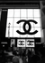 Schwarz-weißes Gemälde eines großen beleuchteten Fensters mit einem großen Chanel-Logo. Unten am Fenster sind Menschen und ein Auto zu sehen.