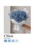 Ein Gemälde mit einem Arm einer Person, die einen großen Strauß hellblauer Blumen hält, eingewickelt in blaues und weißes Papier. Darunter der Text Chloé, Paris, Frankreich.