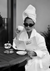 Dieses Gemälde zeigt eine elegante Dame auf einem Balkon, die in ihrem Bademantel auf einem Stuhl sitzt, eine Tasse Kaffee trinkt und die Speisekarte liest.