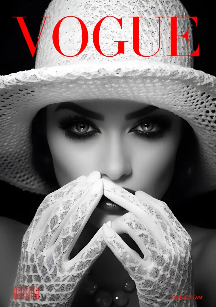 Gemälde eines Modemagazincovers mit dem Titel "VOGUE" mit einer Nahaufnahme einer Frau mit weißem Hut und Spitzenhandschuhen.