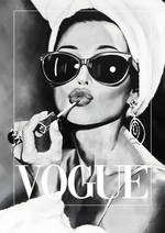 Ein schwarz-weißes Gemälde einer stilvollen Frau, die eine große Sonnenbrille trägt und ein Handtuch auf dem Kopf hat, während sie Lippenstift aufträgt. Dabei ist das VOGUE-Logo zu lesen.