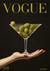 Schwarzweißes Gemälde eines Vogue-Magazintitels mit einer Frauenhand, die ein Martiniglas mit Oliven hält.