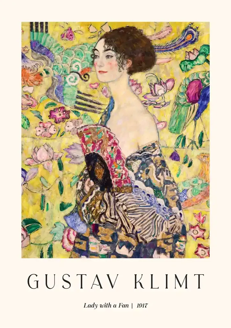 Dieses Gemälde, "Lady With A Fan" von Gustav Klimt aus dem Jahr 1917, zeigt eine Frau mit einer wunderschönen Frisur, die einen Fächer hält, vor einem farbenfrohen Hintergrund, der mit Blumen und abstrakten Mustern verziert ist.
