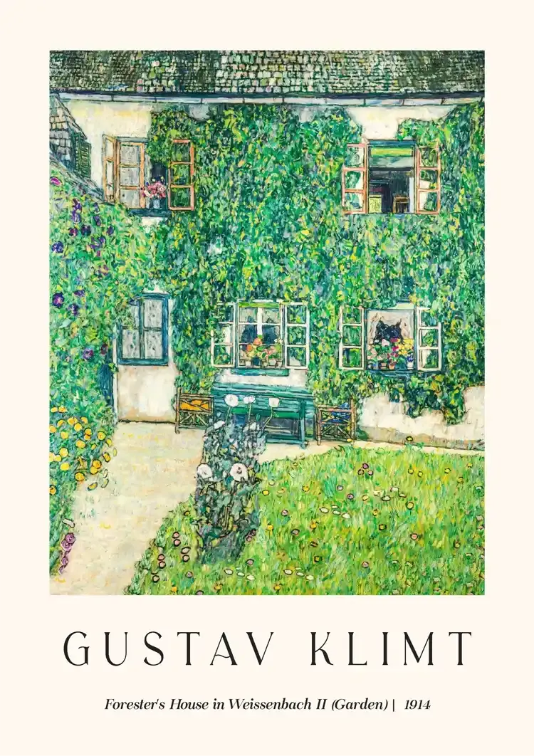 Dieses Gemälde von Gustav Klimt aus dem Jahr 1914, mit dem Titel "Forsthaus in Weissenbach II (Garten)", zeigt ein Haus, umgeben von üppigem Grün und Blumen im Garten. Eine Holzbank steht an der Wand, während mehrere Fenster geöffnet sind, was dem Haus eine einladende Atmosphäre verleiht.