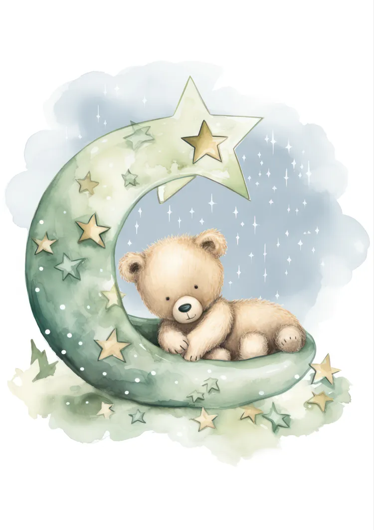 Dieses charmante Gemälde zeigt einen niedlichen Teddybären, der sich auf einem grünen Halbmond räkelt, umgeben von funkelnden Sternen. Der weiche, wolkenartige Hintergrund verleiht eine verträumte Note.