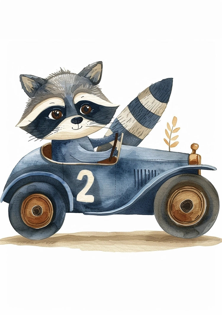 Dieses Gemälde zeigt einen Waschbären in einem coolen, blauen Vintage-Auto mit der Nummer 2 an der Seite.