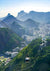Dieses Gemälde zeigt eine Seilbahn, die über ein üppiges, städtisches Tal mit hohen Gebäuden und schroffen Bergen im Hintergrund hinabfährt.