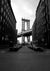 Ein Schwarz-Weiß-Gemälde einer Stadtstraße, die zur Manhattan Bridge führt.