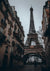 Dieses Gemälde zeigt einen Blick auf den Eiffelturm von einer engen Straße voller traditioneller Pariser Gebäude.