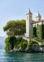 Auf diesem Gemälde sieht man eine Insel mit einem großen weißen Turm.
