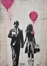 Dieses Gemälde zeigt eine schwarz-weiße Schablonengraffiti von einem Mann und einer Frau, die nebeneinander gehen, jeder mit einem knallpinken Ballon in der Hand.