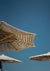 Dieses Gemälde zeigt drei gewebte, strohfarbene Sonnenschirme vor einem klarblauen Himmel.