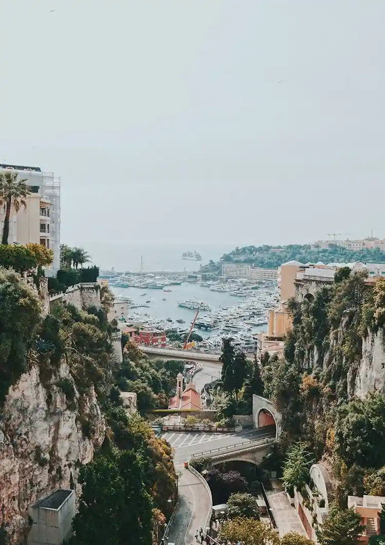 Dieses Gemälde zeigt eine Küstenlandschaft mit Gebäuden, eine gewundene Straße, die durch eine felsige Landschaft führt, und einen Hafen voller Boote.