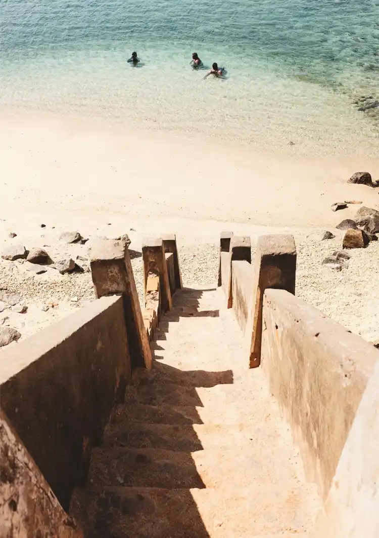 Ein Gemälde mit einer Treppe, die nach unten zum Meer führt, mit mehreren Menschen.