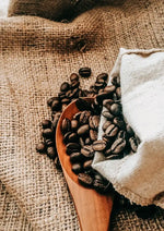 Dieses Gemälde zeigt eine Nahaufnahme eines Löffels mit Kaffeebohnen. Ein guter Start in den Tag!