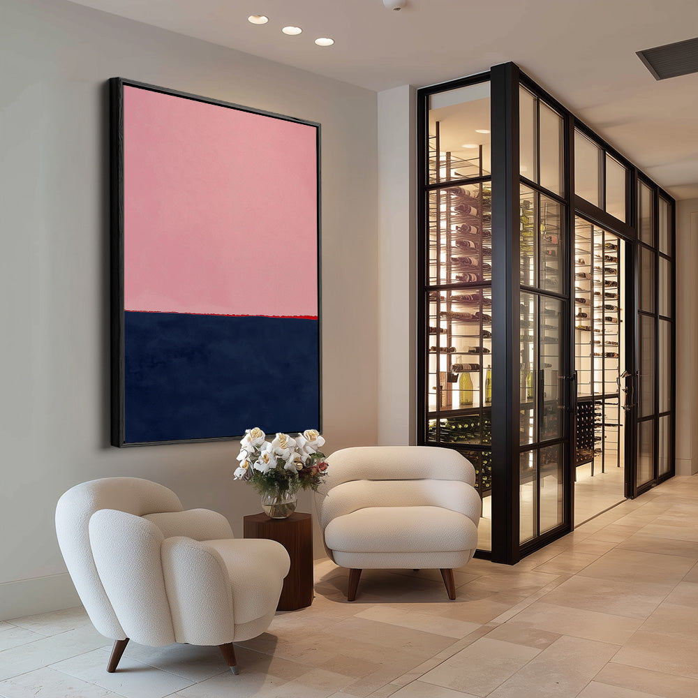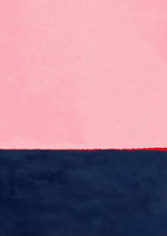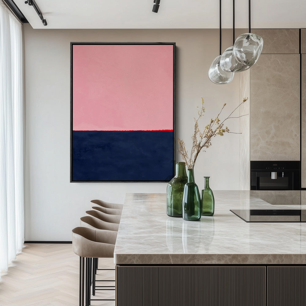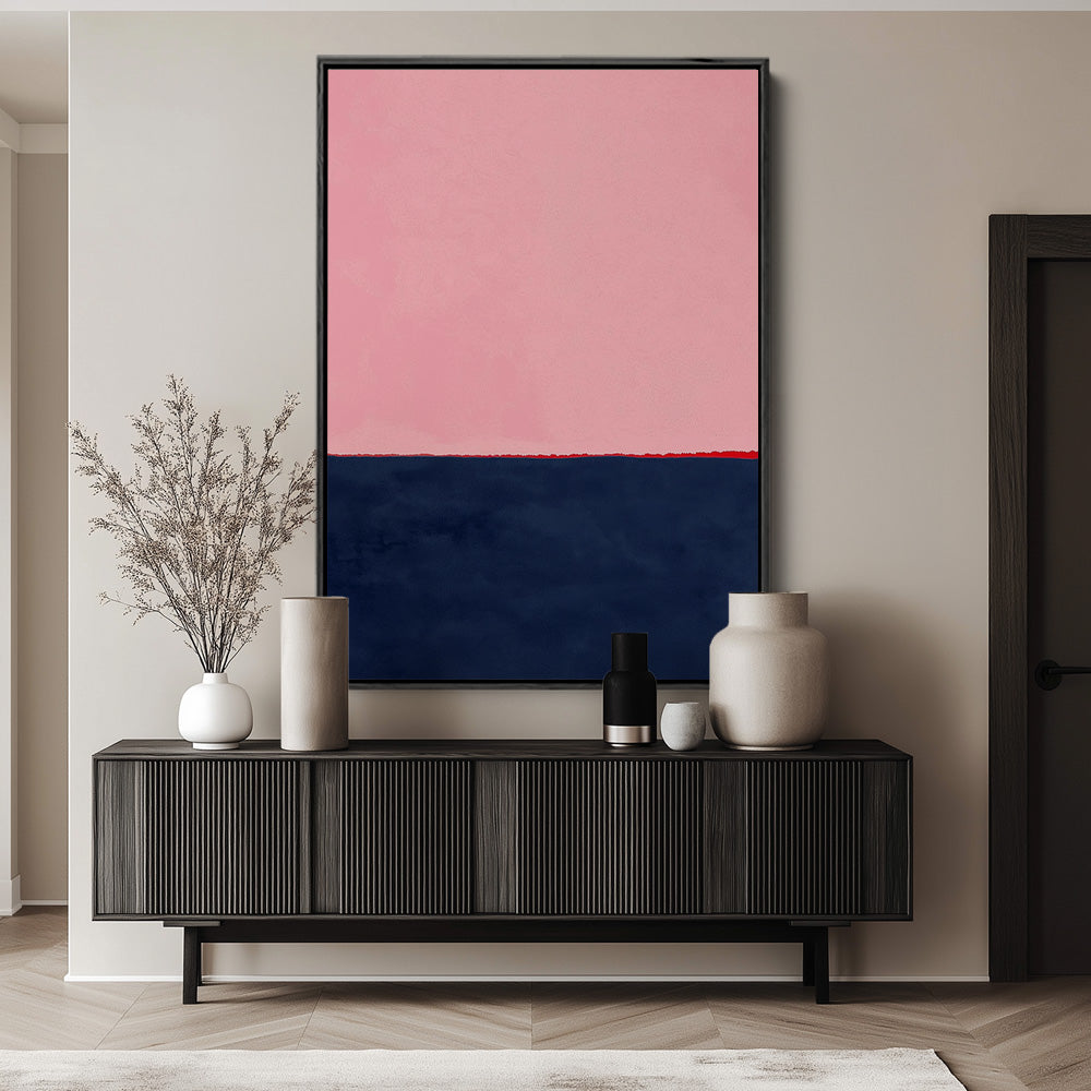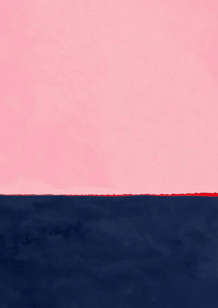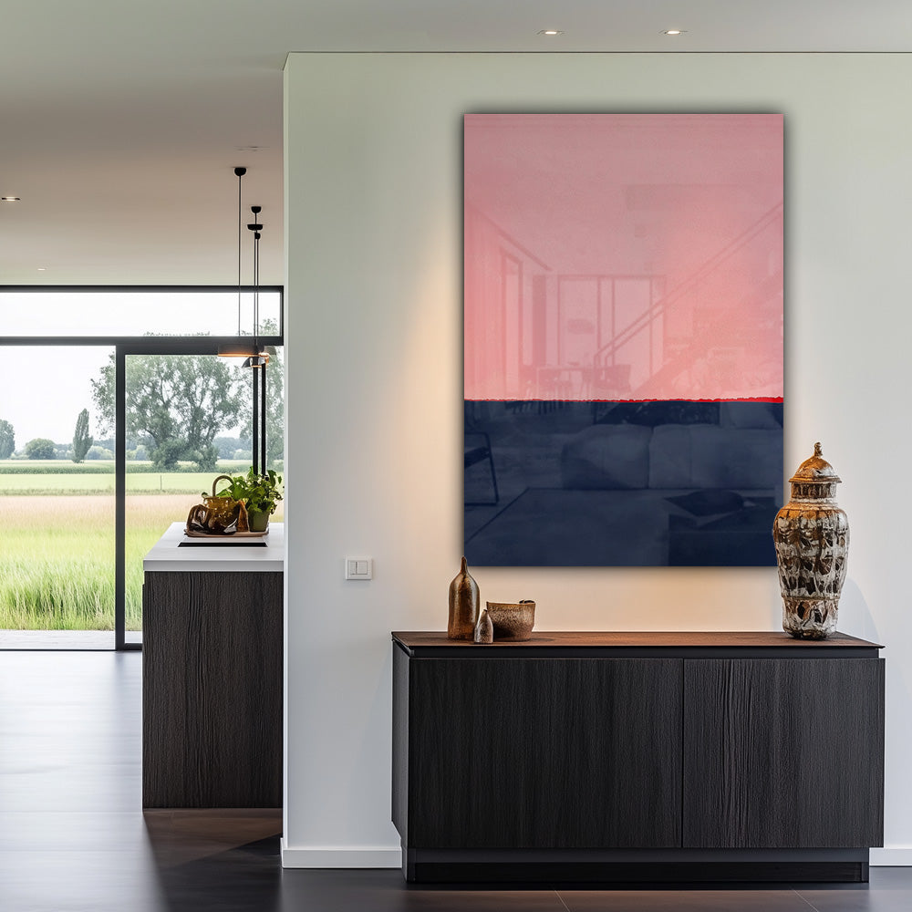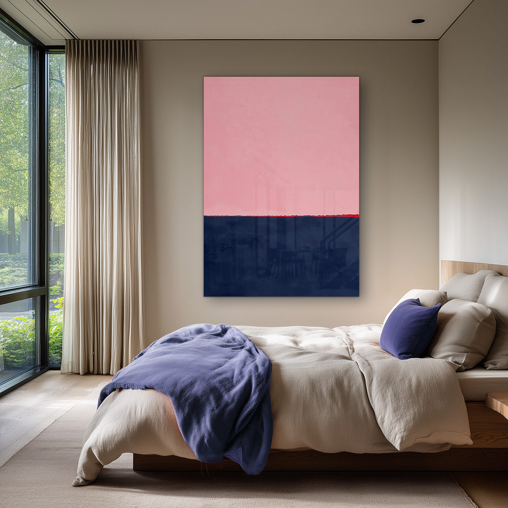Eine minimalistische Landschaft, in der sanftes Rosa und tiefes Blau in einer ruhigen, kontemplativen Balance aufeinandertreffen.