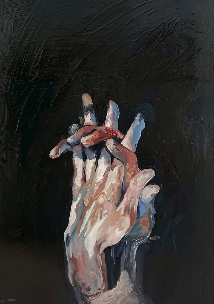 Ein intimes Gemälde voller Emotionen von zwei ineinander verschlungenen Händen vor dunklem Hintergrund.