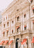 Dieses Gemälde zeigt ein historisches Gebäude mit schicken Details, vielen Fenstern mit roten Vordächern und einer großen Bogenpforte. Es verfügt über klassische Merkmale wie Säulen und Fries.