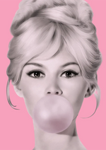 Dieses Gemälde zeigt eine Frau mit einem trendigen Haarschnitt, die eine große Kaugummiblase bläst, vor einem rosa Hintergrund, der ihre Verspieltheit betont.