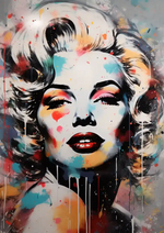 Dieses Gemälde zeigt ein farbenfrohes und abstraktes Porträt von Marilyn Monroe mit lebendigen Farbspritzern und ausdrucksstarken Gesichtszügen.