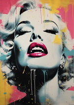 Dieses Gemälde zeigt ein farbenfrohes Porträt von Marilyn Monroe mit dramatischen Spritzern aus gelber, rosa und blauer Farbe.