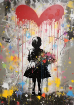 Dieses Gemälde zeigt ein Kunstwerk mit der Silhouette eines Kindes, das Blumen hält, vor einem spritzenden Hintergrund mit einem großen, tropfenden roten Herz darüber.