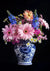 Gemälde eines Straußes in einer blau-weißen Vase mit rosa und pfirsichfarbenen Gerbera-Margeriten, blauen Rittersporn, weißen Margeriten und kleinen rosa Blumen auf schwarzem Hintergrund.
