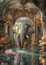 Dieses Gemälde zeigt einen Elefanten in einem flachen, eleganten Innenpool, umgeben von üppigen goldenen und blumigen Dekorationen mit luxuriösen Kronleuchtern.