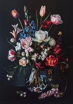 Dieses Gemälde zeigt einen bunten Blumenstrauß in einer klaren Vase vor einem dunklen Hintergrund. Mit Tulpen, Pfingstrosen, Rosen und anderen Blüten in Rosa, Rot, Blau und Weiß.