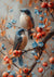 Auf diesem Gemälde sehen Sie zwei Vögel mit blauen Köpfen, orangen Brüsten und blauen sowie orangen Flügeln, die auf einem Ast sitzen, der mit blauen Blumen und orangen Beeren geschmückt ist. Der Hintergrund ist neutral mit einem sanften, verschwommenen Effekt.